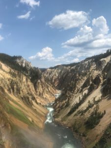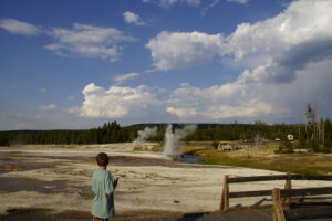 We reden naar Yellowstone. Eerst kwamen we langs Fishing Bridge. We liepen vanaf een parkeerplaats een stuk naar de brug en eigenlijk viel dit een beetje tegen. We vonden de uitzichten hier een beetje tegenvallen. Bij de souvenirs shop kocht Alex een pet en F een kettinkje met een beer. Er waren verschillende kettinkjes met dieren en allen met een eigen betekenis. Deze beer zou (volgens mij) staan voor het overleven in de natuur, het vertrouwen op jezelf. Je bent sterker dan je denkt.