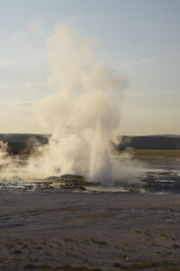 We wilden eigenlijk nog wel wat van het nationale park zien en besloten naar Old Faithful te rijden. De bekendste geiser van Yellowstone. Na een uur rijden waren we er. Rond 17.45 uur kwamen we aan en lazen we in het visitors Centre dat de volgende ”uitbarsting” werd verwacht om 18.01 uur. Dat kwam perfect uit. Er was nog plek op de bankjes. Uiteindelijk duurde het nog zo’n 20 minuten voor het hoogtepunt. Wat bijzonder!