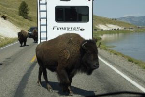 Toen we de camper weer instapten en doorreden naar de volgende stop was er een file. In een nationaal park??? Ja zeker. Veroorzaakt door dieren. Bizons op de weg. We zagen heel veel ‘buffalo’s’. Naast de weg, op de weg, voor de auto, in het land. Zo veel! We maakten foto’s vanuit de camper. Heel voorzichtig met het raam open. Toen ze langs de auto liepen ging het raampje toch maar even dicht. Deze konden we van ons Mustsee lijstje strepen.