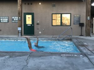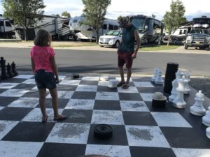 Op weg naar een zwembad.. met water! Na drie uurtjes rijden kwamen we aan om 14.00 uur. We stonden op een hele mooie camping, van Sun Outdoor. Wel naast de snelweg, maar daar hebben we geen last van gehad. Snel lunchen en zwemkleren aan. Het was heel warm buiten, maar dat water was dan wel weer even wennen. Brrr. De kinderen waren aan het schaken en dammen buiten op het grote schaakbord. N. was erg moe en ging gelijk naar bed. F en L gingen tot zonsondergang zwemmen. Ik ging mee, tot ik lek geprikt werd door de muggen. Ondertussen las ik het boek dat ik leende bij de camperverhuurder in San Francisco. We zaten tot laat buiten. Het was echt heerlijk weer.