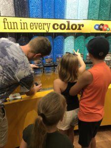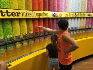 Na het drankje liepen we langs de verschillende hotels en stapten binnen bij het Escaliber. De jongens die we in het zwembad in Page hadden ontmoet zeiden dat er een soort gokhal was voor kinderen in hun kasteelhotel. Dat moest deze wel zijn. De arcade was in de kelder. En wat vonden de kinderen het leuk. We kochten voor alle drie een pasje en ze deden spelletjes om punten te verzamelen. De meiden kozen een pop it armbandje voor de punten en L een mini Rubiks cube. Voor de overige punten kregen ze drie kleine zakjes met mini M&M’s.