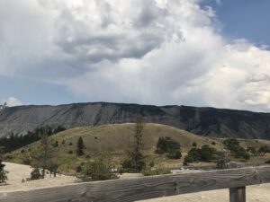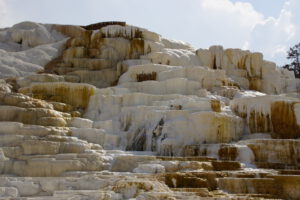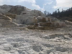 We reden verder naar Mammoth Hot springs. We hadden een paar weken geleden niet verwacht dat we hier naar toe konden. Een groot deel van de weg naar Mammoth hot springs was weggevaagd tijdens de overstromingen in juni. Gelukkig waren ze heel fanatiek aan het repareren en konden we Mammoth Hot Springs bewonderen. Ook al zeiden we in de camper dat we niet meer wilden klimmen, deze trappen wilden we wel op. Alleen de jongste zag er niet zo het nut van in.