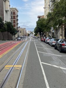 Tijdens de wandeling kochten we wat fruit bij Walgreens. Dat aten we terwijl we op een bankje zaten naast een cable car halte. We hadden al gezien dat er aan het begin een hele lange rij stond voor de cable car. Toevallig kwam er een lege cable car langs en mochten wij mee voor 8 dollar p.p. We kregen achteraf het geld voor de kinderen nog terug.
