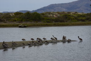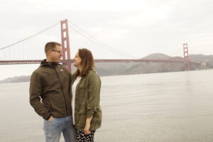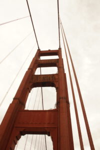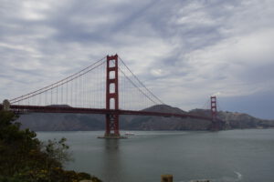 Om 04.00 uur was het al druk in het hotel. Gelukkig vielen we bijna allemaal weer in slaap tot 07.00 uur. Bijna allemaal, ik bleef wakker. Ja, toch een jetlag. Het zou vandaag gaan regenen. De Golden Gate Bridge stond op het programma. 8,6 km lopen naar de brug toe zagen we niet zitten en de metro kwam ook niet op de plek van bestemming. De bus leek ons ingewikkeld, met meerdere keren overstappen. Dus kozen we wederom voor Uber. Voor 28 dollar hadden we een grote auto met chauffeur die ons naar Presidio National Park bracht. We liepen langs de kust en zagen de brug zelfs zonder mist. Dat is een uitzondering geloof ik. N wilde heel graag ook echt op de brug lopen, want niemand uit haar klas had dat ooit gedaan.