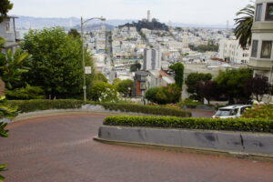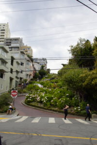 We liepen naar Lombard Street. Deze steile en meest bochtige straat van San Francisco is bekend van de vele foto’s en films. Toch wel bijzonder. Ook al is het maar een straat. Je zult er maar wonen. Zoveel toeristen elke dag. En dan ook nog elke keer die helling op en af moeten, wat zullen je benen dan gespierd zijn. We liepen de trappen op en buiten adem kwam ik aan. L, F en N renden zelfs een stukje. Hoe dan?