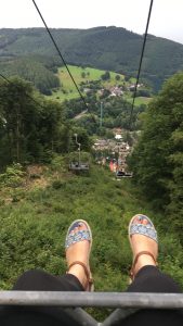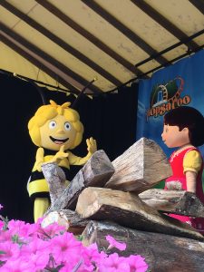 En dan heb je nog Bumba voor de jongste, kartonnen poppen van K3 voor de middelste en ROX voor de oudste. De broodjes die we meegenomen hadden zijn zo droog dat de vogeltjes meer kruimels hebben dan dat wat er in onze mond komt. Maar aangezien we al €7,50 voor drie kleine zakjes chips kwijt zijn, gaan we liever eten buiten het park. En de kinderen besluiten dat het friet op de camping wordt. Als afsluiting gaan zoon en ik met de kabelbaan omhoog. Dan valt het hem eigenlijk pas op hoe hoog het hier is.