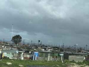 We kwamen door hele sjieke wijken met enorme huizen met grote hekken er om en prikkeldraad. En daar direct naast huisjes van golfplaten. Wat een contrast. Wel was er ook een groot onderscheid tussen de wijken van golfplaten. Sommige hadden schotels en gevaarlijke elektriciteitskabels er boven hangen. Anderen leken nog minder te hebben en in Kaapstad zagen we ook een grasveld vol met ‘tentjes’ van doeken en vuilniszakken.