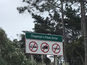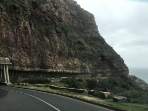 F werd niet helemaal fit wakker. Hoofdpijn en misselijk. Tijdens het ontbijt wilde ze weinig eten, een kopje thee ging er wel in. Gelukkig voelde ze zich al snel beter. Lang leve de zetpillen. We hadden vandaag een autorit gepland. Eerst reden we over Chapman’s Peak. We betaalden tol en moesten toen een paar honderd meter later het bonnetje nog eens laten zien. Gelukkig hadden we deze niet te ver weggestopt. Dus mocht je de route gaan rijden, houd er rekening mee dat je het bonnetje goed bewaard. Ooit gekozen als mooiste autoroute ter wereld hoorde ik. Een prachtige route, maar deze zou nog mooier zijn als het zonnetje zou schijnen. Het waaide keihard en het weer werd steeds slechter. Regen en harde wind. Brr.