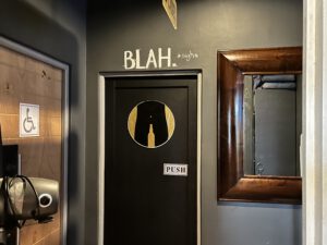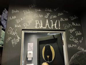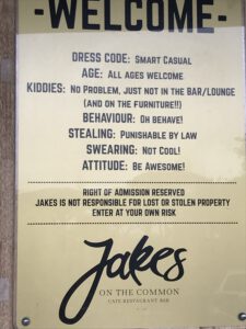 Na Chapman’s Peak zagen we een restaurantje langs de weg. Jakkes noemde de jongste het. De echte naam was Jakes. Een heel leuk restaurant met allemaal geinige bordjes e.d. Zoals boven het herentoilet ‘blah’ en boven het damestoilet ‘blah blah blah blah’… Heren urinoirs voor small, lage en pfff. En meer van dat soort dingetjes. Heel anders dan alle restaurants die we tot nu toe gezien hadden. We dronken koffie/thee en warme chocomel en bestelden 2 borrelplanken. Lekker, maar wel spicy.
