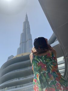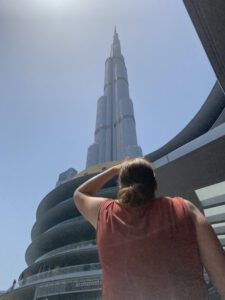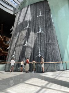 Verder zagen we een enorme speelgoedwinkel, mooie indoor waterval, heel veel wc’s (we bleven plassen hier), de ijsbaan, veel te dure winkels en veel te bloot geklede mensen. We aten donuts of een veel te duur gebakje. Daarna liepen we toch nog een keer naar buiten om de oversteek te maken naar Souk Al Bahar en Time Out Market. Een mooi gebouw, met oosterse invloeden, maar we waren toch al snel weer terug in de Dubai Mall.