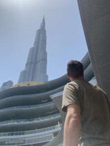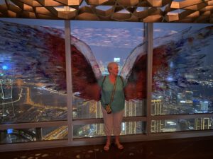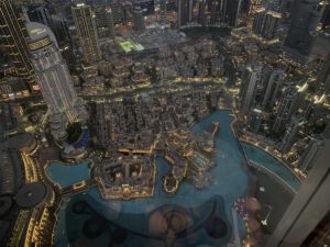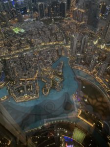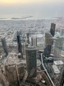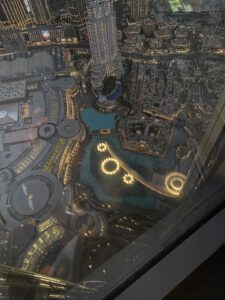 Na de fonteinenshow gingen we naar ‘At the Top’. De ingang voor de Burj Khalifa. Een hele rijen een snelle lift verder stonden we met licht op de 125e verdieping. Bewust niet hoger, vanwege de hoge kosten. 45 of 195 euro per persoon is met zessen toch wel een enorm verschil.