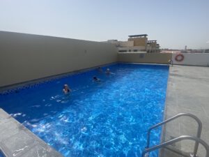 In het Premier Inn Dubai International Airport hotel boekten we 2 kamers, elk met een groot tweepersoonsbed en een slaapbank. We kregen een twee persoonskamer en driepersoonskamer met extra bed met tussendeur. Alleen stond er een bed voor de deur, dus konden we deze niet gebruiken. De jongste sliep bij oma en de oudste twee bij ons.